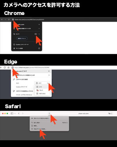 ブラウザの設定を変更してカメラへのアクセスを許可してください。